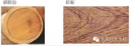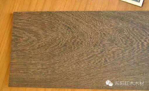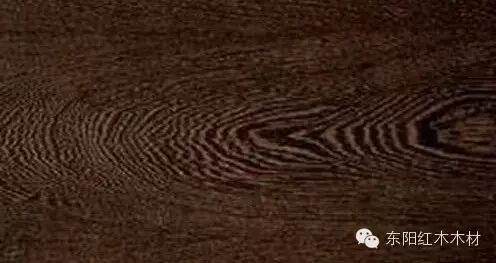 心材紫褐色或深栗褐色,生长轮不明显,波痕略见,弦切面可看到明显的鸡翅花纹,纹理比较细腻。