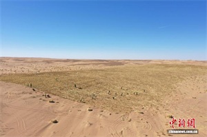 走进获各琦苏木境内的本巴图沙漠项目区,治沙工人正俯身将一束束稻草均匀铺展在沙地上。随着机械的轰鸣声响起,稻草被深深压入沙中,仅留半截挺立地表。横竖交错、规整有序的草方格在沙丘上连绵延伸,为茫茫黄沙织起了一道道防护网。