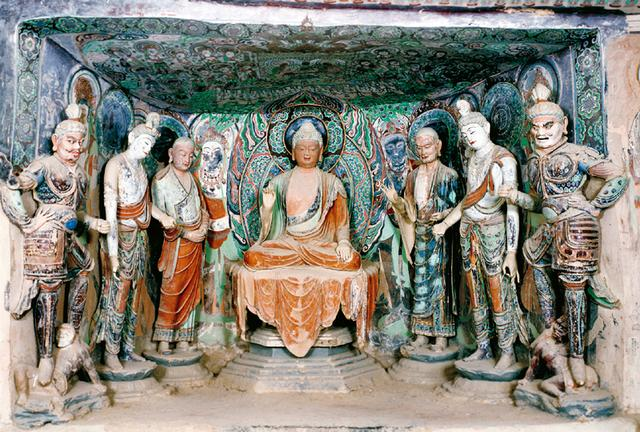 盛唐时期的敦煌彩塑写实性很强。高超的写实技巧使这些塑像栩栩如生,同时艺术家非常注意雕塑的群体性。第45窟这一组7身彩塑,以佛为中心,左右大体对称排列,塑像目光俯视,参观者会感到每身塑像都在看着你。图为莫高窟第45窟西壁龛内彩塑。 敦煌研究院供图 张伟文/摄