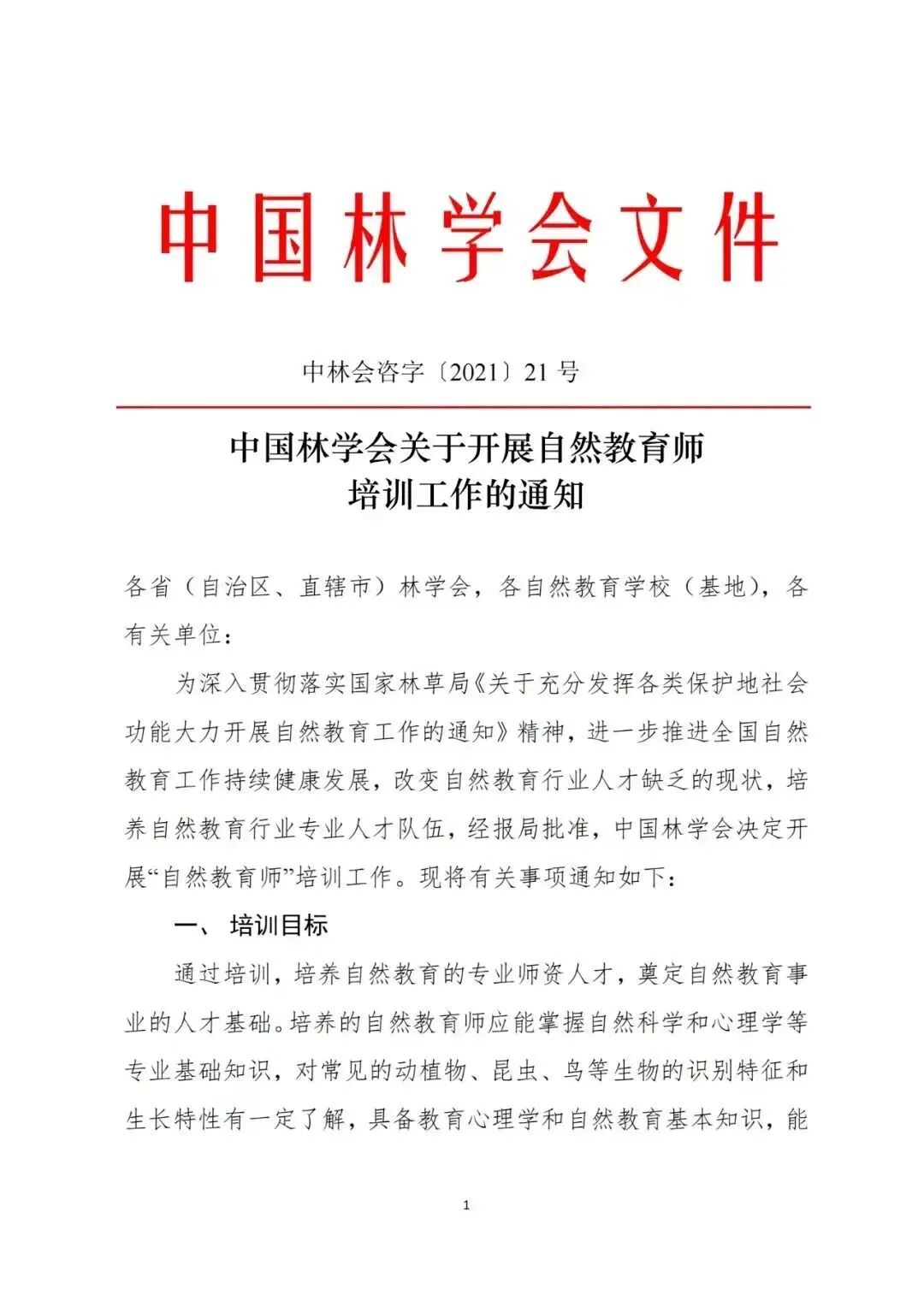 为深入贯彻落实国家林业和草原局印发的《关于充分发挥各类保护地社会功能大力开展自然教育工作的通知》文件精神,进一步推进全国自然教育工作持续健康发展,改变自然教育行业人才缺乏的现状,培养自然教育行业专业人才队伍,经报国家林业和草原局批准,中国林学会决定开展"自然教育师"培训工作。