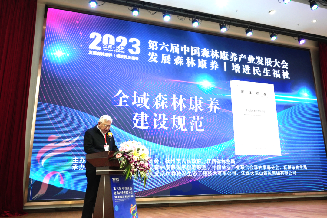 2023年3月27-29日,由中国林业产业联合会、江西省林业局、抚州市人民政府联合主办的第六届中国森林康养产业发展大会在抚州市资溪县举办。会上发布了中国林业产业联合会森林康养分会、江西省抚州市林业局联合提出,东华理工大学、中国林业产业联合会森林康养分会、江西省抚州市林业局、国家林业和草原局森林康养国家创新联盟等单位起草的《全域森林康养建设规范》团体标准。该标准填补了国内针对地方政府发展全域森林康养产业缺少指导标准的空白,为推动各地党委政府切实推动全域森林康养产业提供了有益指导。 (东华理工大学原副校长、教授花明发布《全域森林康养建设规范》标准)