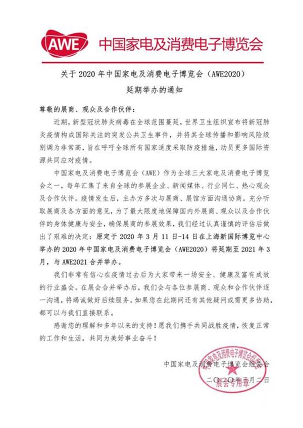 此前,AWE组委会曾表示AWE2020将延期举办。
